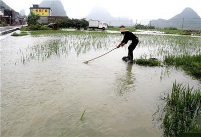 6月5日晚至6日早晨,广西河池市罗城仫佬族自治县遭受暴雨袭击,河水上涨,部分地区农作物受灾,当地农民在降雨过后积极开展生产自救,力争降低损失。